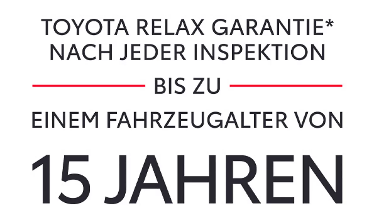 * Es gelten die Toyota Relax Garantiebedingungen der Toyota Motor Europe S.A./N.V., Avenue du Bourget 60, B-1140 Brüssel, Belgien. Die Toyota Relax Garantie gilt ausschließlich für Toyota Fahrzeuge nach jeder Inspektion bei einem Toyota Partner bis zu einem Fahrzeugalter von 15 Jahren oder einer Laufleistung von 250.000 km. Die Toyota Relax Garantielaufzeit beträgt 12 oder 24 Monate in Abhängigkeit des für das Fahrzeug vorgesehenen Inspektionsintervalls. Weitere Details sowie die Garantiebedingungen erhalten Sie unter http://www.toyota.de/relax.